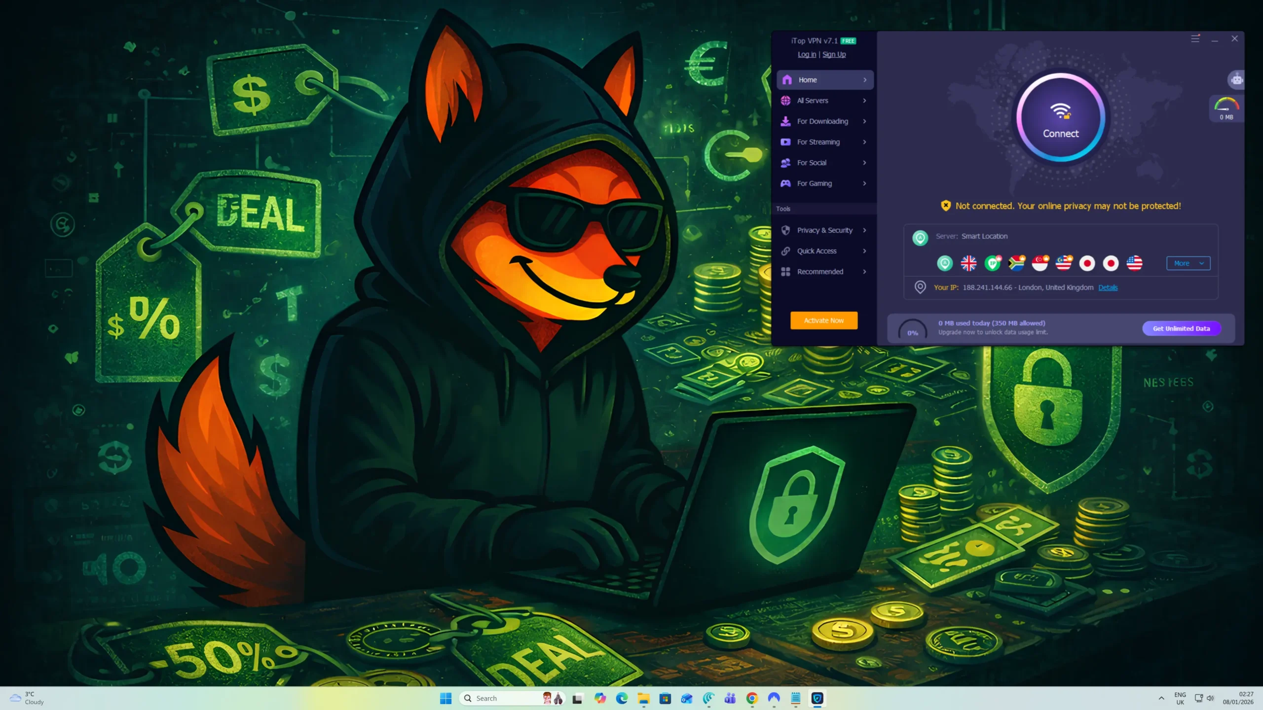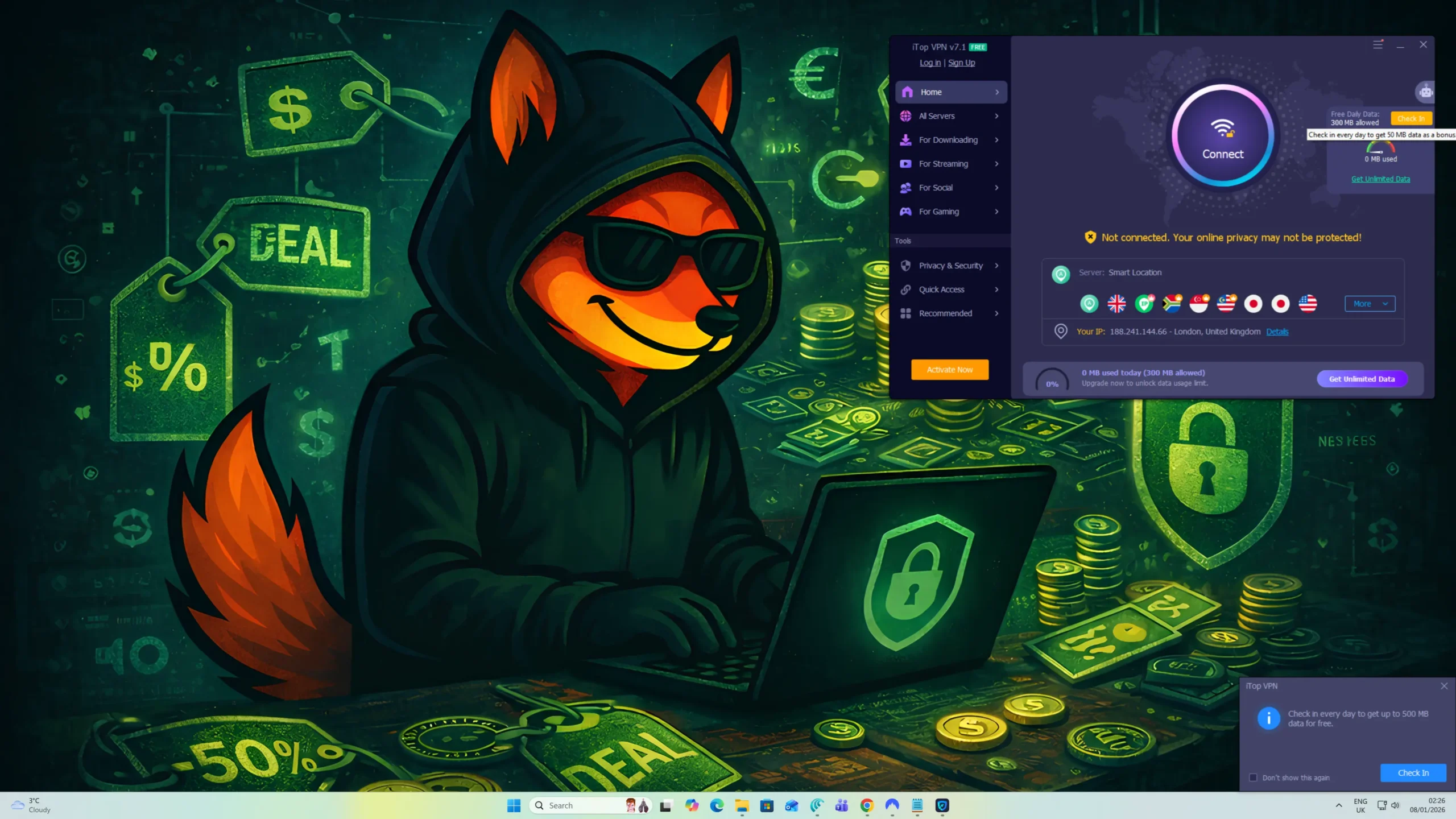 iTop VPN provides a functional free tier that currently gives users a 300MB daily data allowance. While this is lower than previous years, it remains a practical option for quick tasks like checking emails or secure banking without the pressure of a monthly commitment.