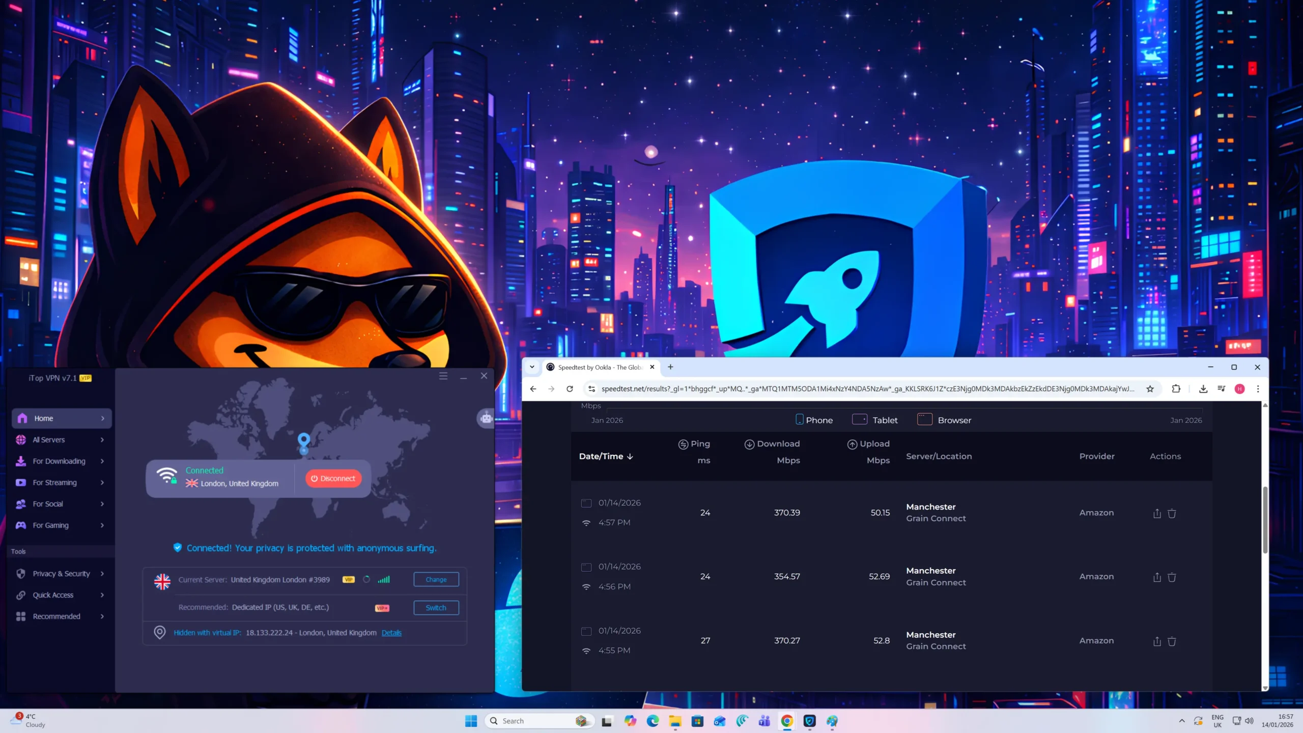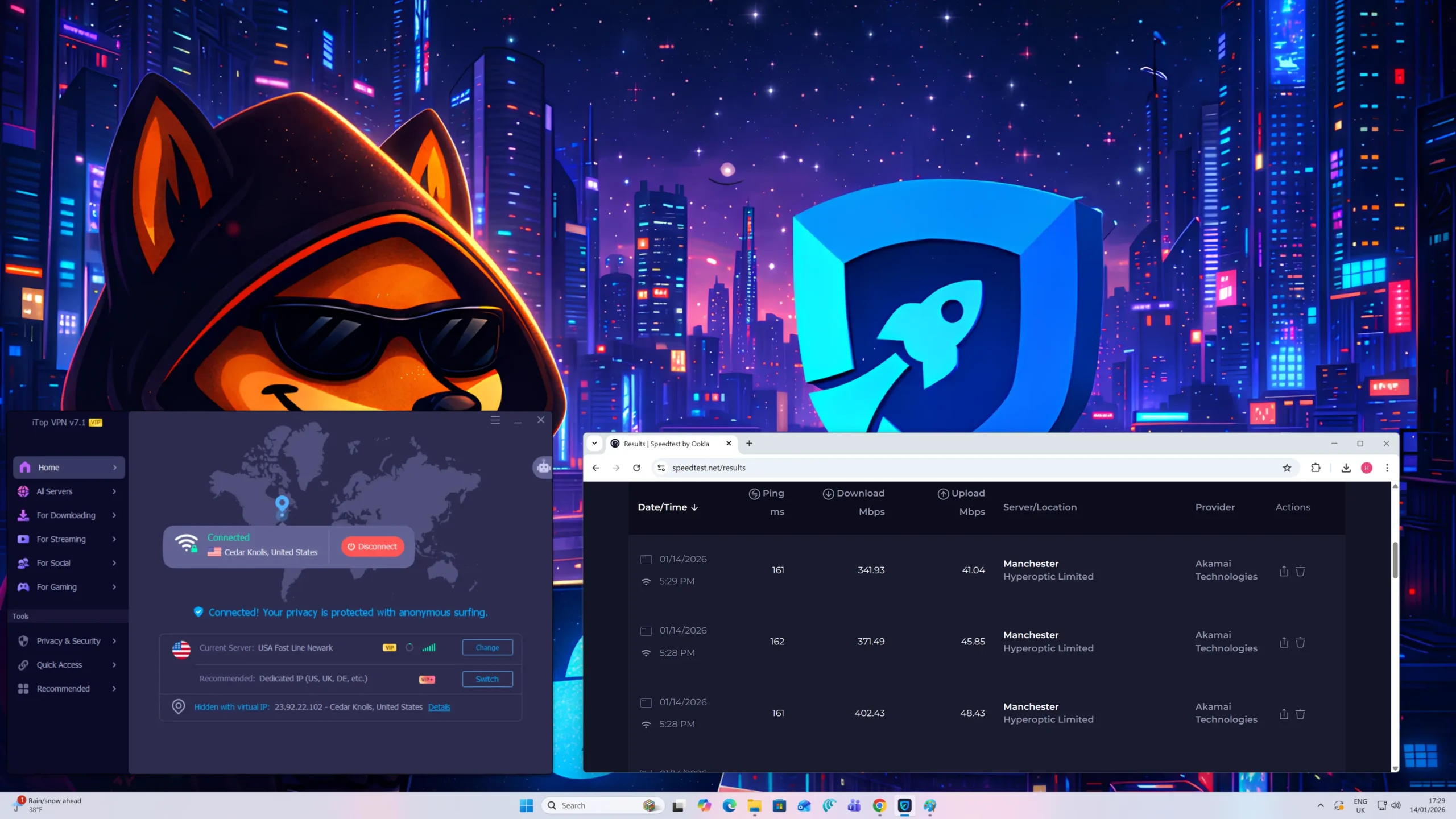 The data confirms that iTop VPN is not just spoofing locations; they are using high-quality bare-metal servers, especially in the US. While the local UK speeds have a slight cap, the trans-Atlantic performance is top-tier, making it an excellent choice for unlocking global content.