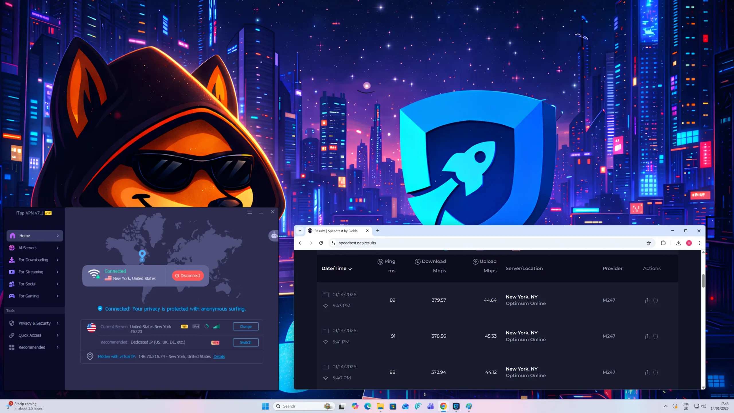 - The "370 Mbps" Limit: Whether we connected to a server 50 miles away in London or 3,500 miles away in New York, the speed hovered around 370 Mbps. This suggests iTop has a very consistent network performance cap, likely to ensure stability for all users.