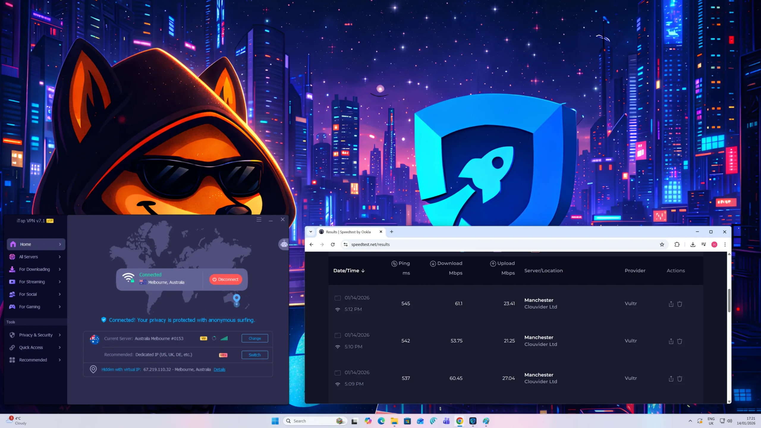 To ensure total transparency, we have archived the raw screenshots from this session. Authenticity Verification: Every screenshot below includes our mascot (Ech) and the iTop VPN client interface clearly visible in the background. This serves as undeniable proof that we actually performed these tests on our rig and didn't simply manufacture the results.